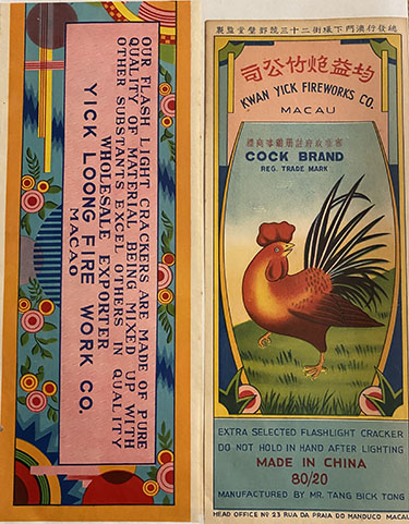 Lady Manhattan Brand - Manufactured by Foshan, Guangdong, China Circa 1970's and 80's ** Pandas Select - "Super Charged" - Distributed by A&W Sales Co., Muncy, PA Circa 1970's and 80's** Giraffe Brand - Made in China Circa 1950's and 60's**Camel Brand - Wang Yick Fireworks Co., Made in Macau Circa 1950's and 60's** 2" Superior Mandarin - "Flying Fairy Brand" - Made in China Circa 1950's**OK Brand - Made in Macau - Po Sing Firecracker Factory Circa 1960's and 70's** Zebra Brand (5/800 Strips) - Li & Fung LTD - Hong Kong, China Circa 1970's thru 90's** Superman Brand 1/2 Brick - Made in China for Buckeye Fireworks Co., Ohio Circa 1980's**Flying Dragon Brand (5/400 Strips) - Made in China Circa 1980's thru 90's**Red Devil Brand 1/2 Brick - Made in China Circa 1970's and 80's** Great Wall, Island Dragon and Chinese Junk - Made in Guangxi, China 40 Strips of 50's Circa 1980's** "A recent discovery from the Forties"15 Packs of 80 x 7/8" Lady Crackers "Warrior Brand" Strips14 Packs of Blue Ribbon Brand "Red, White and Blue Colored Firecracker SalutesLarge Box of Paper Coned Report Bottle Flyers "Peacock Brand"1 Red Devil Silver Rain Fountain1 Comet Chaser Whistles Zig Zag with Report3 - 20 Ball Rozzi's Roman Candles**All items are fused with black Match**Courtesy of Cordier Auctions, Harrisburg, PA** A selection of vintage postcards from the early 1900's** From Top Left - ClockwiseCats Brand - 7/8" x 1/6" Lady Fingers - Macau - "A small chap with a loud voice"Home Run Brand - Penny Pack - 1/4" x 1/8" (Rare)Big Boy Brand - Tai Lee Kong - Penny Pack** From LeftFlying Wheel Brand - 16 x 1-1/2" - Yick Loong Co. Macau - 1940'sJumbo (Special) - Kee Chong Hong - 1-11/16" x 16s - Macau - 1930's** From LeftFairy Brand - Sam Yik Saikee Tai Leung - Outside of North Gate Right! Made in China - 1930'sDragon Phoenix Brand - Lady Crackers - Made in China - 1930's** From LeftJungle Brand - 1-1/2" x 40 - Made in China - 1920'sWise Man Brand - 3 1/8" x 2-5/8" Class 1 - 1920's** From LeftSea Horse Brand - 3 x 2-5/8" - Old Yeun Kee - Macau - 1940'sTiger Brand - 16 x 1-1/2" - Sing Lung Co. Canton, China - 1940's** From LeftYuen Shing Mandarin Crackers - 4 1/2" x 4-1/4" (Rare) - 1920's-30'sDragon Brand Mandarin - 5 2-1/2" - Li and Fung Mfg. (Rare)** From Left.Yan Kee Boy Brand - 16 x 1-5/8" - Kwong Hing Tai Macau - 1930's-40'sGolden Dragon - 5 2" - Kwong Man Lung (Rare)** From LeftYick Loong Firework Co. - Macau - 1930's-40'sYankee Doodle Dandy - 2" - Unexcelled Mfg. Co. - NY - 1930's-40's**