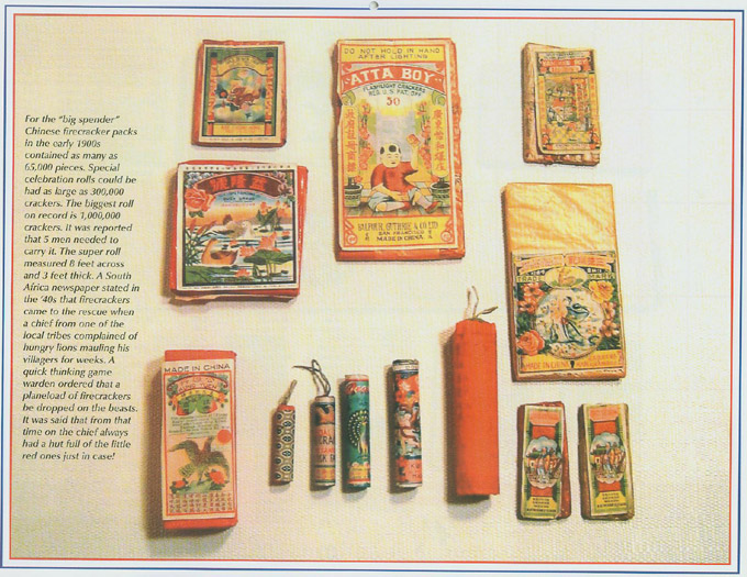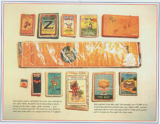 Lady Manhattan Brand - Manufactured by Foshan, Guangdong, China Circa 1970's and 80's ** Pandas Select - "Super Charged" - Distributed by A&W Sales Co., Muncy, PA Circa 1970's and 80's** Giraffe Brand - Made in China Circa 1950's and 60's**Camel Brand - Wang Yick Fireworks Co., Made in Macau Circa 1950's and 60's** 2" Superior Mandarin - "Flying Fairy Brand" - Made in China Circa 1950's**OK Brand - Made in Macau - Po Sing Firecracker Factory Circa 1960's and 70's** Zebra Brand (5/800 Strips) - Li & Fung LTD - Hong Kong, China Circa 1970's thru 90's** Superman Brand 1/2 Brick - Made in China for Buckeye Fireworks Co., Ohio Circa 1980's**Flying Dragon Brand (5/400 Strips) - Made in China Circa 1980's thru 90's**Red Devil Brand 1/2 Brick - Made in China Circa 1970's and 80's** Great Wall, Island Dragon and Chinese Junk - Made in Guangxi, China 40 Strips of 50's Circa 1980's** "A recent discovery from the Forties"15 Packs of 80 x 7/8" Lady Crackers "Warrior Brand" Strips14 Packs of Blue Ribbon Brand "Red, White and Blue Colored Firecracker SalutesLarge Box of Paper Coned Report Bottle Flyers "Peacock Brand"1 Red Devil Silver Rain Fountain1 Comet Chaser Whistles Zig Zag with Report3 - 20 Ball Rozzi's Roman Candles**All items are fused with black Match**Courtesy of Cordier Auctions, Harrisburg, PA** A selection of vintage postcards from the early 1900's** From Top Left - ClockwiseCats Brand - 7/8" x 1/6" Lady Fingers - Macau - "A small chap with a loud voice"Home Run Brand - Penny Pack - 1/4" x 1/8" (Rare)Big Boy Brand - Tai Lee Kong - Penny Pack** From LeftFlying Wheel Brand - 16 x 1-1/2" - Yick Loong Co. Macau - 1940'sJumbo (Special) - Kee Chong Hong - 1-11/16" x 16s - Macau - 1930's** From LeftFairy Brand - Sam Yik Saikee Tai Leung - Outside of North Gate Right! Made in China - 1930'sDragon Phoenix Brand - Lady Crackers - Made in China - 1930's** From LeftJungle Brand - 1-1/2" x 40 - Made in China - 1920'sWise Man Brand - 3 1/8" x 2-5/8" Class 1 - 1920's** From LeftSea Horse Brand - 3 x 2-5/8" - Old Yeun Kee - Macau - 1940'sTiger Brand - 16 x 1-1/2" - Sing Lung Co. Canton, China - 1940's** From LeftYuen Shing Mandarin Crackers - 4 1/2" x 4-1/4" (Rare) - 1920's-30'sDragon Brand Mandarin - 5 2-1/2" - Li and Fung Mfg. (Rare)** From Left.Yan Kee Boy Brand - 16 x 1-5/8" - Kwong Hing Tai Macau - 1930's-40'sGolden Dragon - 5 2" - Kwong Man Lung (Rare)** From LeftYick Loong Firework Co. - Macau - 1930's-40'sYankee Doodle Dandy - 2" - Unexcelled Mfg. Co. - NY - 1930's-40's**